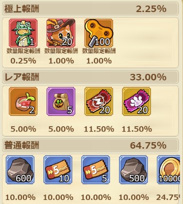 | 加速券x10枚 | 加速券x5枚 | 鉱石x500個 | コインx10000枚 |