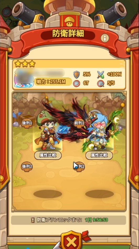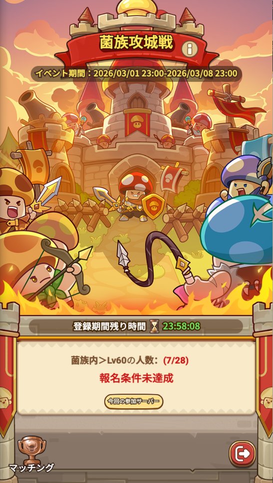 攻城戦は2vs2形式で行われ、プレイヤーはコンテンツ専用のキノコ人形と共に戦います。先に2キャラが全滅した方が敗北となり、制限時間終了時に全員生存している場合は、残り体力の合計が高い方が勝利となります。