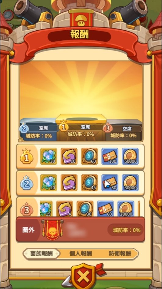 菌族攻城戦では、各菌族が防衛建築物を所有します。各建築物は100%の城防率を持ち、0%まで低下すると破壊されます。防衛と進攻を通じて、自菌族の城防率を他の菌族より高く保つことで、豪華報酬を獲得できます。