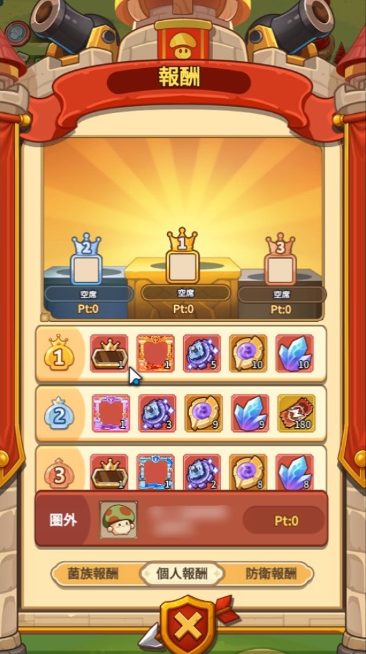 土曜20:00にイベントが終了して集計が行われ、日曜00:00に報酬が一括配布されます。報酬には個人順位報酬、菌族総城防率順位報酬、防衛報酬があります。防衛報酬には本城防衛報酬と防衛塔防衛報酬があり、建築物が破壊されなかった日に応じて報酬を獲得できます。