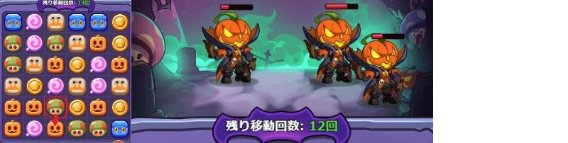 画像の赤枠内のキノコとかぼちゃを入れ替えるとカボチャが3つ揃うので消す事が可能