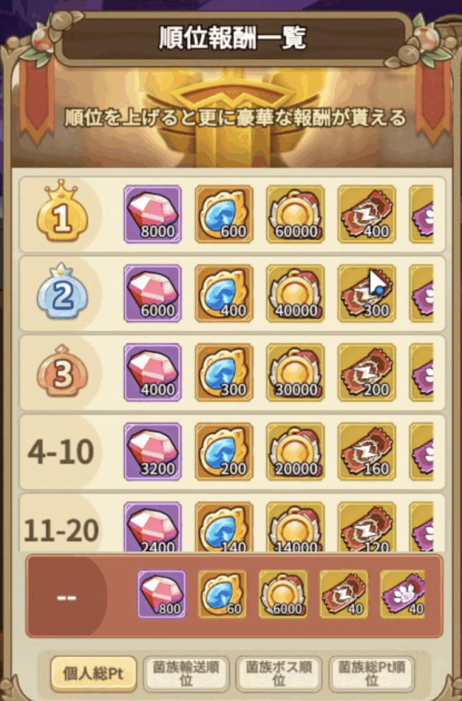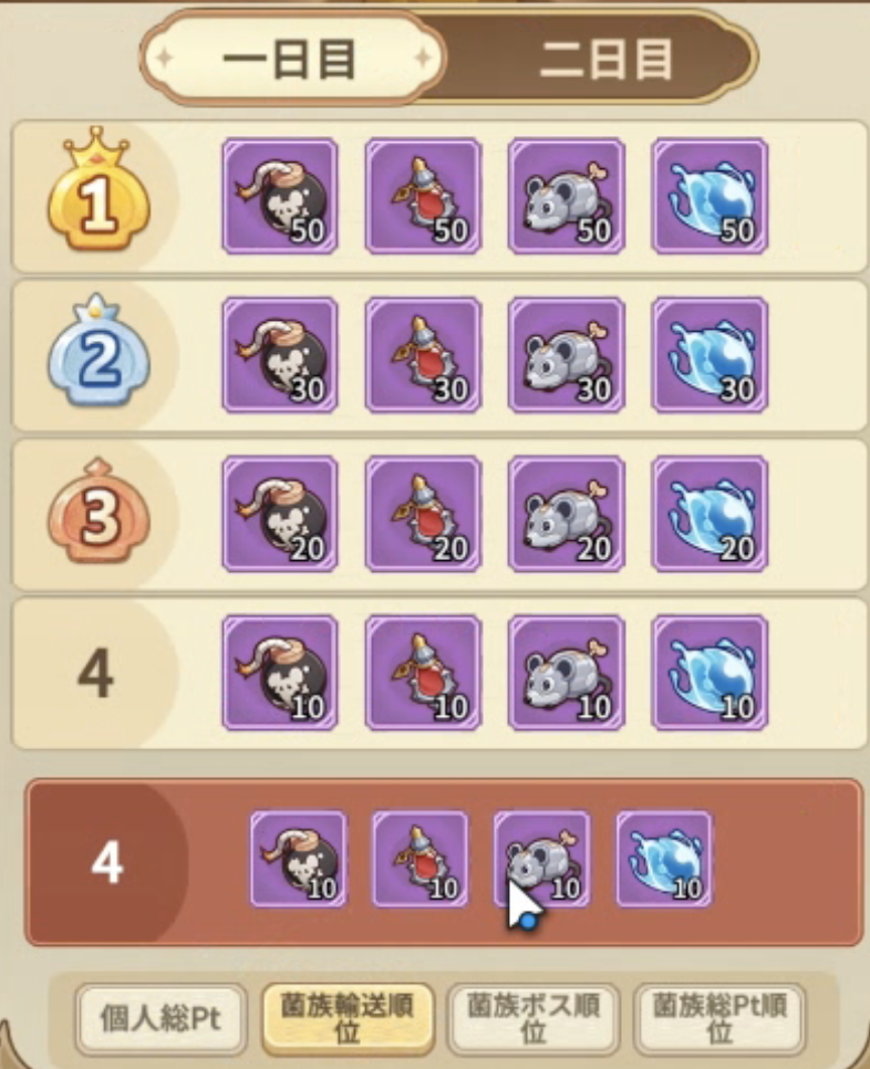 - 個人Pt順位:イベント期間中に獲得した名声値に基づき、マッチングされた菌族グループ内のプレイヤーと順位を競います。
