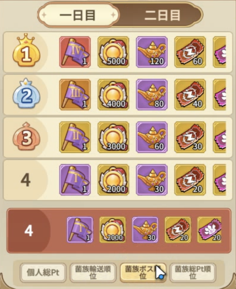 その日に該当菌族のプレイヤーたちが獲得した名声の合計値を記録し、毎日の大盗賊襲来開始時に順位が集計されます。報酬として、大盗賊襲来で使用する砲弾や、妨害道具を獲得できます。二日目も順位報酬は同じです。