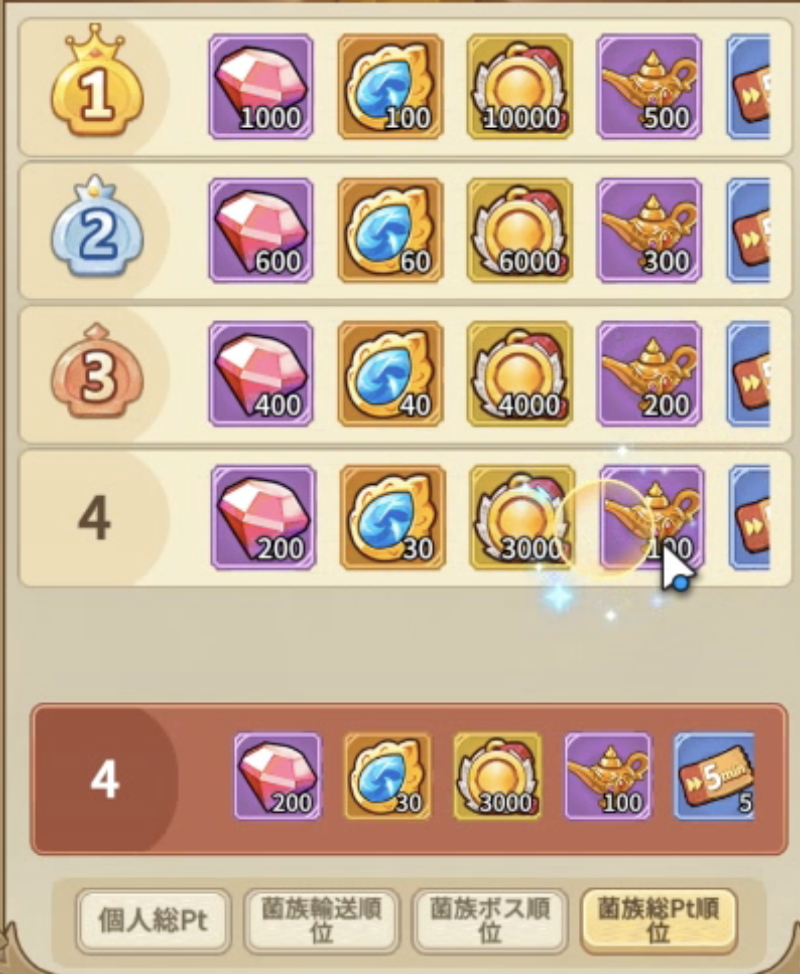 菌族輸送順位:その日に該当菌族のプレイヤーたちが獲得した名声の合計値を記録し、毎日の大盗賊襲来開始時に順位が集計されます。その時点での順位に基づき、大盗賊襲来に参加するプレイヤーたちに一定数のイベント物資が配布されます。