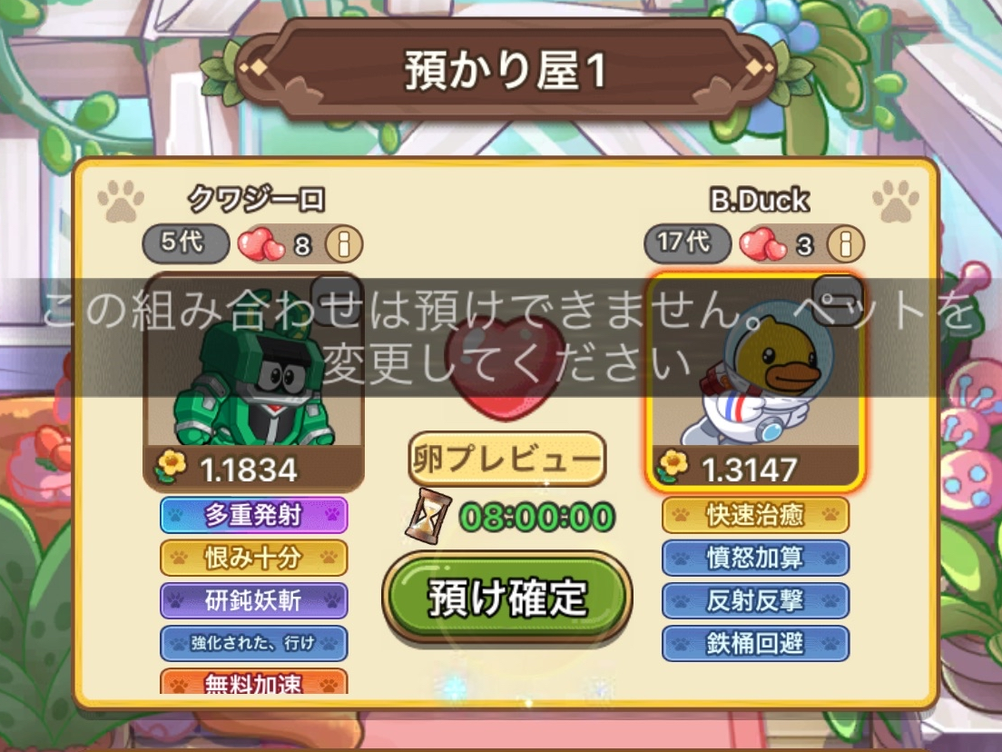 ちなみに、B.Duckコラボのレアペット「B.Duck」は預けられません。