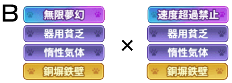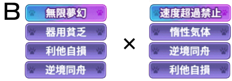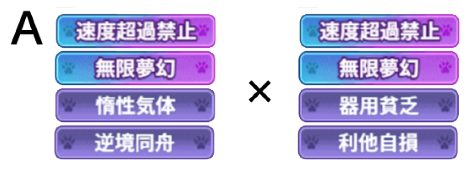 不要な受動ステータスのウェイトを見ます。Aは逆境同舟と利他自損で合計6、Bは銅塀鉄壁が2個ありますがウェイトは1個ぶんの5。不要な受動のウェイトが小さいBが正解