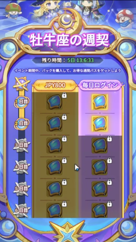 毎日ログインでイベントガチャアイテムを獲得できます。毎日ログインだけで7回分獲得できますが、800円課金するとさらに9回分追加で獲得できます(通常のパッケージは800円で8回分なので、1回分お得です)