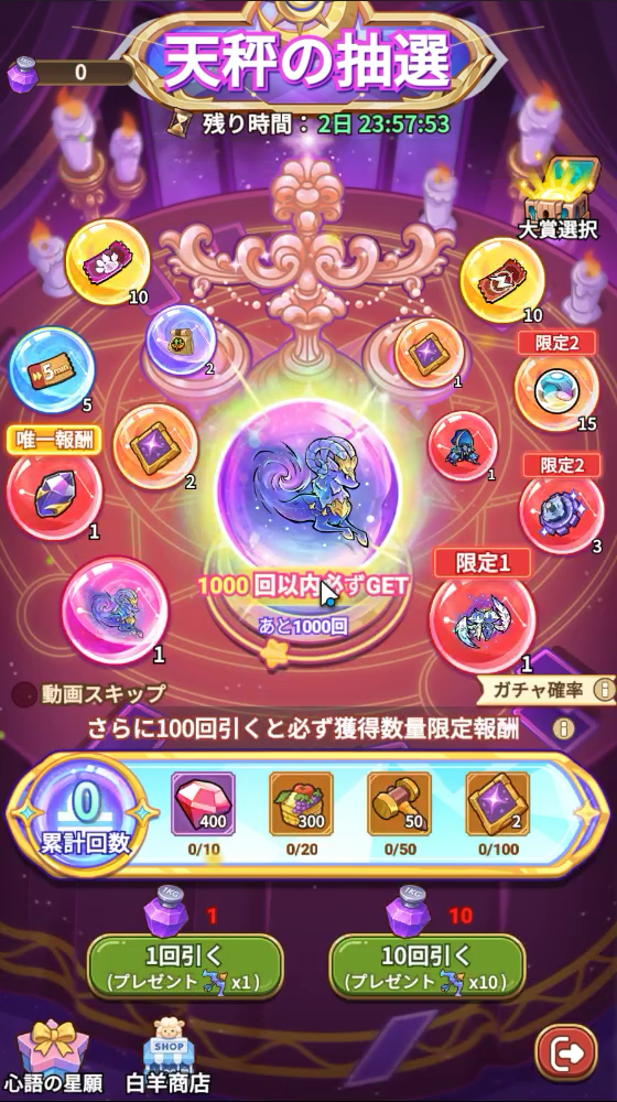 | JPY800 | 1回 | 赤ダイヤx1050+選択アイテム2種 |