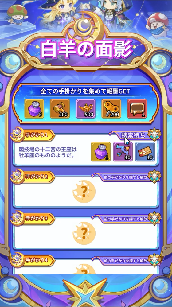 手がかりをヒントにゲーム内に隠れているキャラクターを見つけて、アイテムを獲得しましょう!全ての手がかりを集めると限定発言枠が獲得できます!
