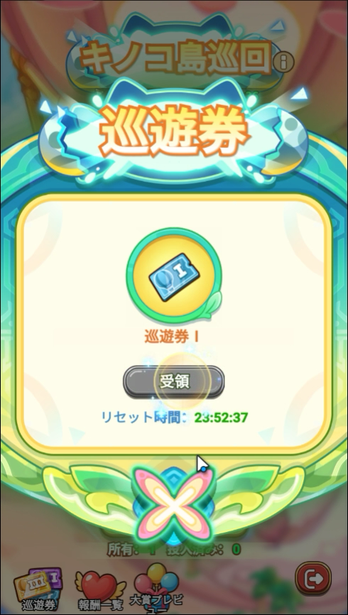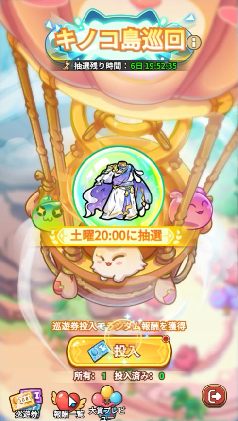 抽選に参加するための「巡遊券」を毎日受取って使用すると、抽選に参加できます。大賞の抽選は毎週土曜20:00に行われるため、土曜20:00をすぎるとこの期の巡遊券は無効になってしまいます。早めに使いましょう!