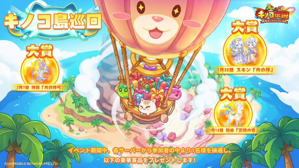 - 神器・騎乗・外観プレゼントコンテンツ「キノコ島巡回」で巡遊券を受取・使用し、抽選に参加する
