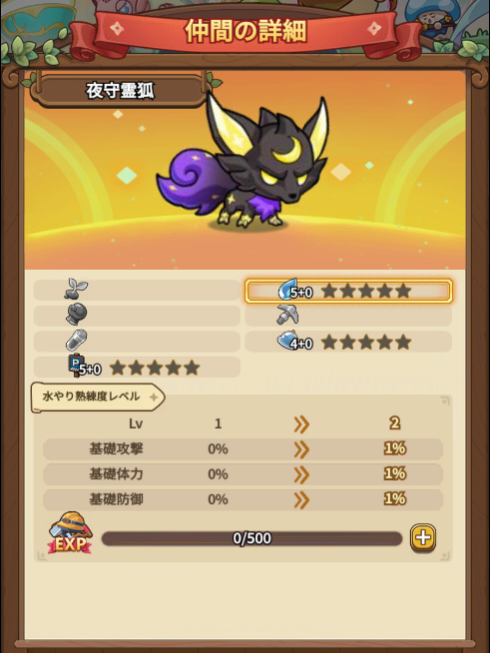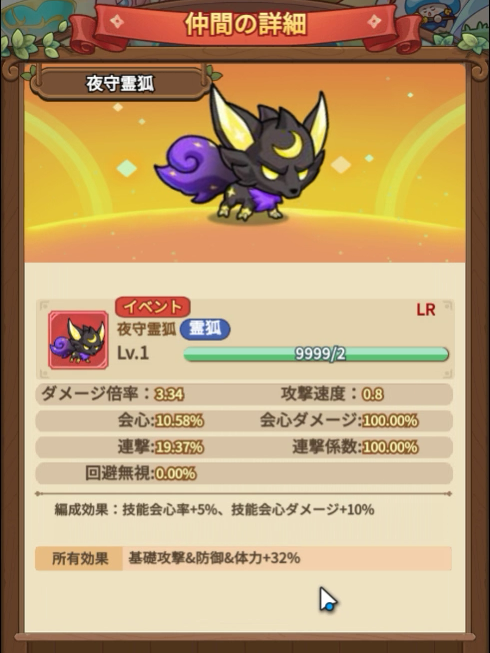 新仲間・夜守霊狐は魔職の火力を上げます!(技能会心率+5%、技能会心ダメージ+10%)会心職が幸運の使者