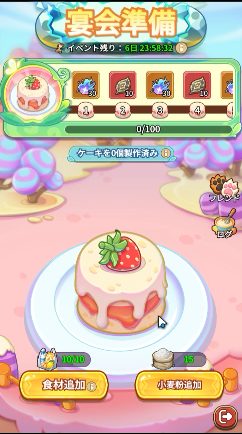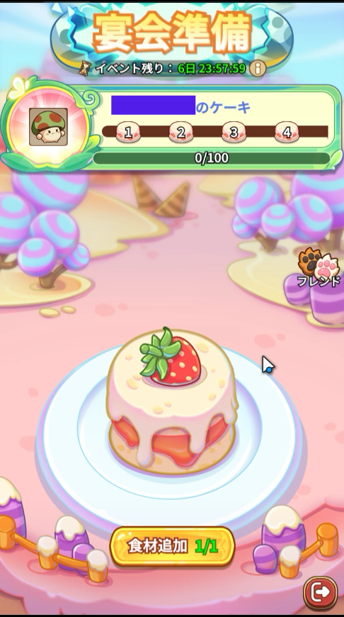 - (2/24以降)イベント内育成コンテンツ「宴会準備」で自分のケーキを作ったり、フレンドのケーキに食材を足して育成を手伝う