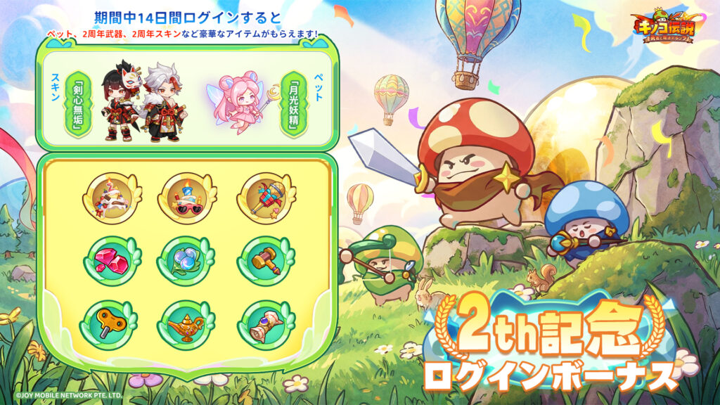 ログインイベントでは先日実装されたばかりのレアペット「月光妖精」や、限定スキン「剣心無垢」、限定外観「祝2周年」「ハッピービジョン」「未来を歌う」など、様々なゲームアイテムが獲得できます!