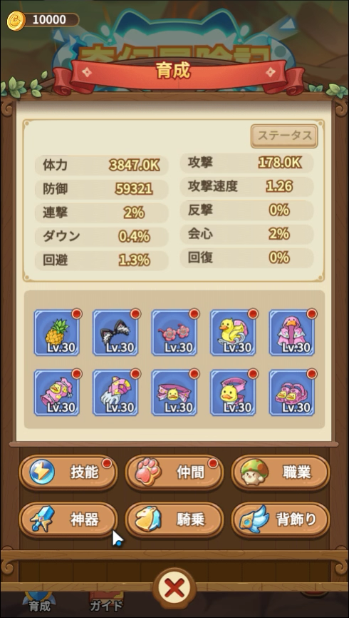 茸生simの進化版です!クリア報酬で獲得したコインで育成するのは変わりませんが、神器は奇幻冒険記をすべて、騎乗は第12章まで、背飾りは第13章までクリア後に解放されます。