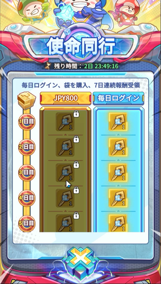 ログインボーナスでガチャアイテムを獲得できます!800円購入すると更に追加で獲得できます。全てを獲得するのに7日かかりますが通常のパッケージよりお得なので、課金する方はこちらから購入がおすすめです!